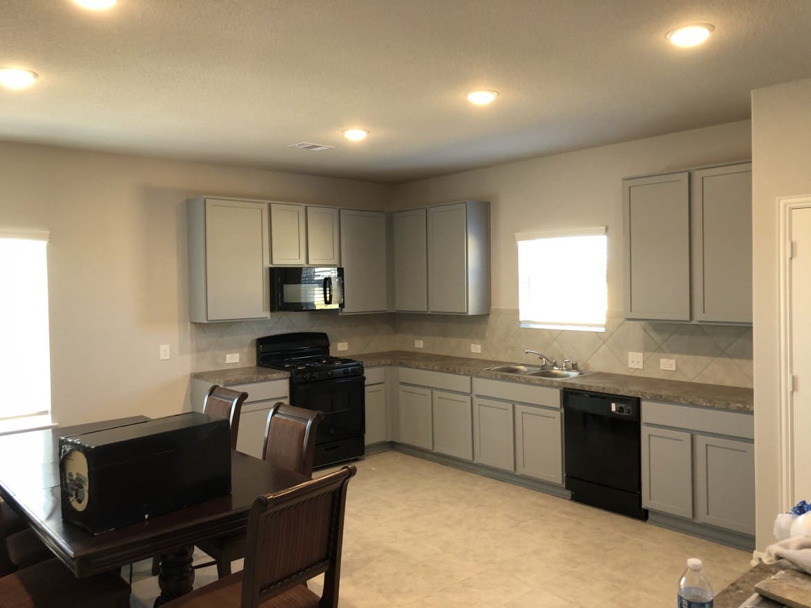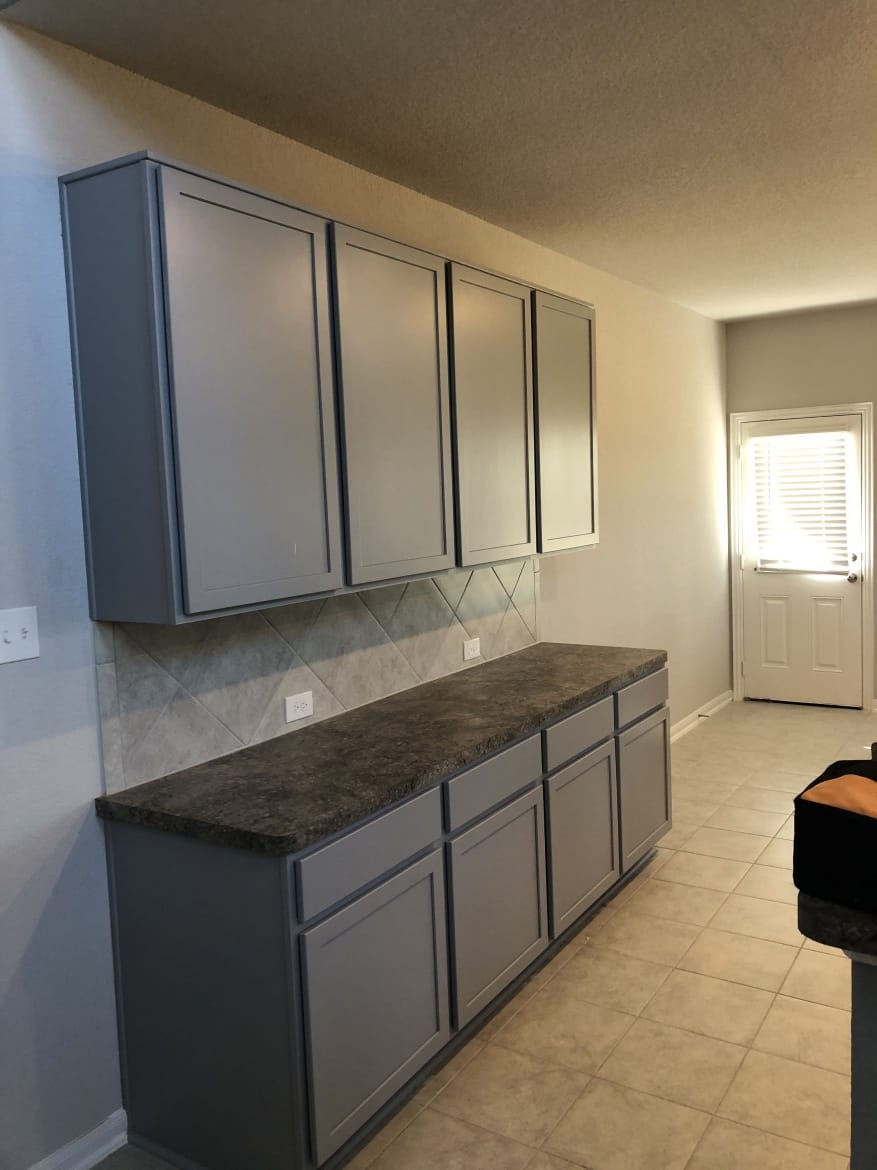 In this project Tex Touch Remodeling did a great transformation of color for kitchen cabinets, after sanding, applying primer, and spraying cabinets with a customized grey color. Customers were very surprised by this change in their kitchen and practically fell in love with it!